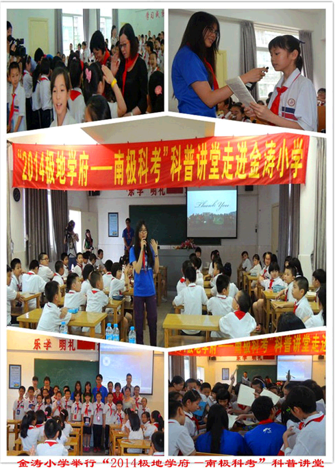 下午3点,金涛小学多功能厅里已经坐满了三、四年级的同学,活动由政教处陈全勇主任主持,首先由少先队员代表向领导和嘉宾授红领巾仪式,活动在中国少年先锋队队歌声中正式开始。汕头大学南极科考队员刘志雄哥哥和罗丽芳姐姐讲述他们在南极科考经历及展示了他们在南极拍摄的一张张图片,精彩的演讲让同学们不时爆发出一阵阵惊喜的欢呼声。不过,最吸引同学们的还是刘志雄哥哥和罗丽芳姐姐征服南极的过程。哥哥姐姐告诉同学们,要去南极,首先要锻炼好身体。在出发去南极之前,他们都要经过2400米负重跑、100米游泳、踩水、仰卧起坐、俯卧撑等体能测试,所以同学们要从现在开始就注意锻炼身体,才能迈出去南极的第一步。同学们听得津津有味,既羡慕刘志雄哥哥和罗丽芳姐姐的经历,又希望自己也能有机会登上南极大陆,哥哥姐姐告诉同学们,要登陆南极大陆,除了锻炼好身体之外,还要做好两点。首先要保护好环境,比如夏天快到了,开空调的时候要注意不要把温度调太低;平时外出游玩的时候,让爸爸妈妈尽量少开车,多搭乘公共交通工具等等,从身边小事做起,才能见效温室效应对南极大陆环境的影响。另外要学好文化知识,才能将自己在南极的所见所闻变成对全人类有益的贡献。