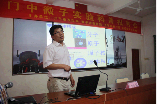 开平市科协为进一步向未成年人普及中微子物理学知识,联合市科技局、市发改局、市教育局于6月12日下午,邀请了中国科学院高能物理研究所专家李小男,在金鸡中学作题为《中微子----通向新物理之门》的科普报告,向在校的200多名中学生传授中微子物理学科普知识,激发广大中学生学习物理的兴趣。