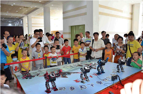 科普大篷车机器人表演 在活动展馆内的科普互动区,科普大篷车带去了车载科普互动展品以及益智玩具、科普机器人表演等。其中机器人跳舞表演吸引了大批的市民围观,别看40厘米高的小机器人,它关节十分灵巧,会跟随节奏跳舞做翻跟斗等动作,科普志愿者在现场对机器人原理和发展作了简单介绍。同时,在科技展品区,展示了历届江门市青少年科技创新大赛优秀发明类作品,其中多项在全国赛、省赛都获得较高奖项。据统计,前来当日前来观看的市民群众约3000人次,派发由江门市科协编印和购置的《身边科普小知识》、《PM2.5知识小册子》和《食品安全知识手册》共1000多本。