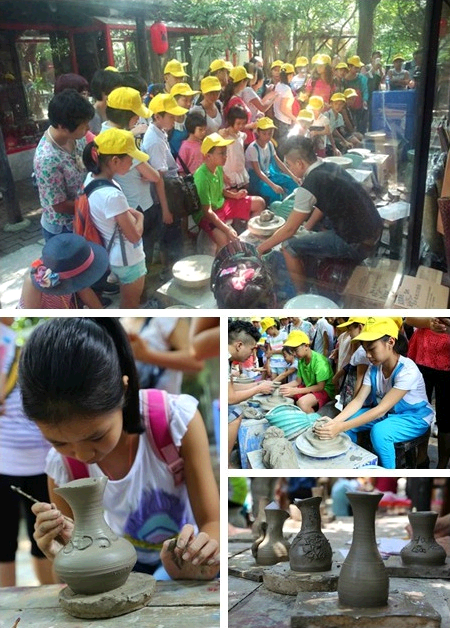 在中国耕读文化体验园——茂德公草堂的陶艺作坊,陶艺制作的老师向大家介绍了陶器制作的原料、使用工具、制作技法、陶瓷烧制和成形等知识,并现场演示了陶艺的制作过程。随后,小营员们在父母的陪伴下亲手参与陶艺制作,他们不时地敲打粘土、揉捏、塑形、一块小小的泥巴,在转动的拉坯机上,一会儿变成细长、一会儿变成矮墩状,不一会的功夫,大家在工作人员的指导下捏造出碗、笔筒、花瓶等精致的成品,孩子们对自己亲手制作出来的陶器都爱不释手。