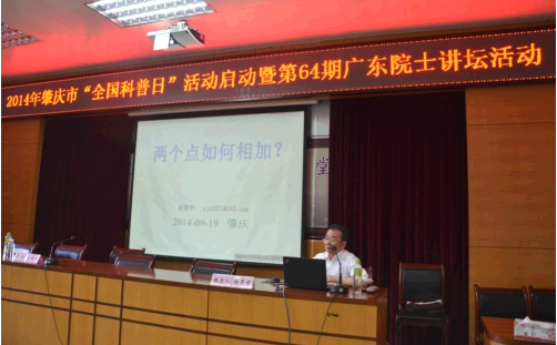 9月19日,广东院士讲坛(第64期)在肇庆市第四中学举行。我国著名的计算机科学家、数学家和数学教育家、科普作家、中国科学院院士张景中应邀为学校师生作专题讲座。本期活动由广东院士联络中心、广东省科技工作者服务中心和肇庆市科协共同主办,省科协党组成员、副主席冯日光,肇庆市政府副秘书长周文浣出席活动并讲话,并同时宣布2014年肇庆市“全国科普日”活动启动。