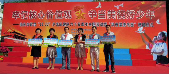 10月13日上午,汕头市科协在龙湖区丹霞小学举行2014年汕头市首批“科普漂流书屋”赠建仪式活动。汕头市科协党组书记、主席洪建芬为首批“科普漂流书屋”建设学校颁发匾牌,与龙湖区副区长孙建文联合为丹霞小学的“科普漂流书屋”揭幕。汕头市政府副市长赵红、团市委书记陈玩雪、龙湖区副区长孙建文、团市委副书记王江锋、市教育局副局长谢崇出席活动,来自各区县、各学校的校长代表和学生代表共1000多人参加了活动。活动由团市委副书记王江锋主持。