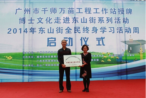 2014年11月25日下午,“广州市千师万苗工程工作站授牌仪式在越秀区东山街达道南社区广场隆重举行。广州市科学技术协会、广州市社会工作委员会、越秀区科学技术协会、东山街办事处及党工委、越秀区社区教育学院、广州市科技类社会组织服务中心、广东博士俱乐部的有关领导、博士代表和东山街道各社区的青少年及社区居民150多人参加出席了本次活动。