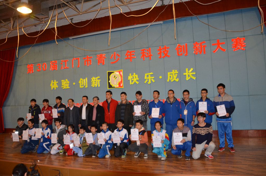 随后,进行了颁奖仪式,由符敦恩老师为获得“专利申请奖”的学生颁发证书和奖品;由余军老师为获得“江门市第一中学校长奖”的学生颁发证书和奖品;由关汝海老师为获得“创新设计小能手”的学生颁发证书和奖品;由赵树培老师、伍炜波老师为获得“科技创新成果项目一等奖”的学生颁发证书和奖品。同时,宣布获得科技创新成果项目一等奖、获得科幻绘画作品一等奖和优秀科技实践活动项目一等奖的作品,将代表江门市参加明年在河源市举办的第30届广东省青少年科技创新大赛。