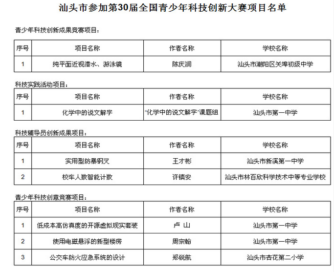 经过省级评审,汕头市共有7个项目(名单见后)被省确定推荐参加第30届全国青少年科技创新大赛,这是汕头市参加全国大赛项目最多的一次,较好的展现出汕头市广大青少年在科技创新活动中的强大活力与工作成绩,也将进一步激发汕头市青少年“爱科学,学科学,用科学”的浓厚兴趣和创造激情。