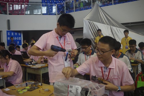 参加基本技能比赛的同学在紧张地调试自己的机器人