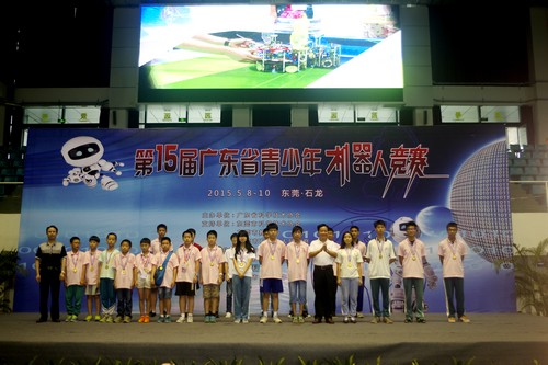 2015年5月10日,第十五届广东省青少年机器人竞赛在东莞市石龙中学顺利闭幕。为期三天的赛事由广东省科学技术协会主办,广东省青少年科技中心、广东省青少年科技教育协会、东莞科学馆和石龙中学承办,全省13个市150多所学校250多支队伍800多名师生参加。省科协副主席吴焕泉,东莞市委常委、统战部部长李小梅,省青少年科技教育协会理事长吴颖民等领导出席颁奖仪式。