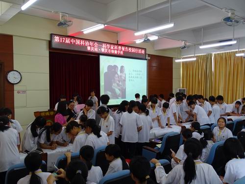 第十七届中国科协年会已于2015年5月23日-24日在广州举办。按照年会筹备工作总体要求,结合我省公众尤其是青少年和社会普遍关注的民生热点问题,广东省科协联合中国科协科普部、广东省教育厅等单位在2015年5月10日-30日期间,组织开展“科学家科普报告校园行”活动,其中,肇庆市承办了9场科普报告会,受到了肇庆市中小学师生的热烈欢迎。