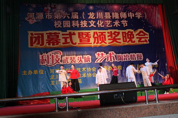5月26日,以“科技武装头脑,艺术陶冶情操”为主题的河源市第六届(龙川县隆师中学)校园科技文化艺术节圆满落幕。河源市科协党组书记、副主席陈春林,市科协副主席钟道良,中共龙川县委副书记钟碧平,龙川县人民政府副县长黄春彭,以及龙川县科协主席杨优生,龙川县教育局局长温小强等领导与2400多名隆师中学师生参加了闭幕式暨颁奖晚会。