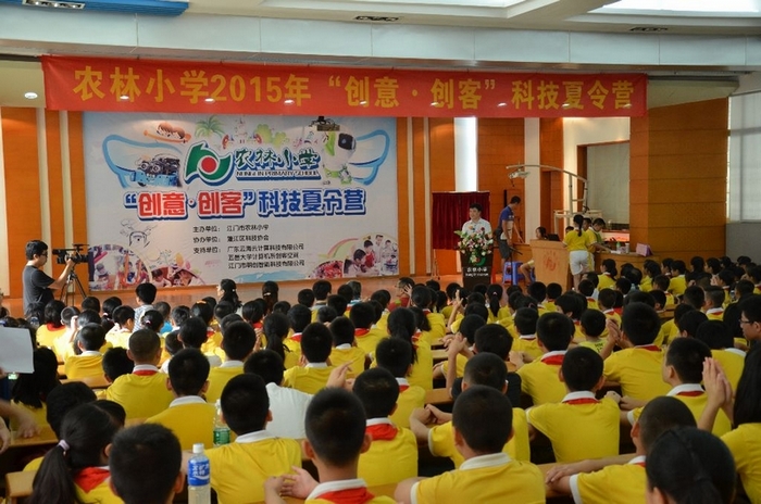 江门蓬江区农林小学为进一步提高学生们认识“创意·创客”内涵、感受“创意·创客”魅力、建立“创意·创客”意识,参与“创意·创客”活动,于当日上午组织学生科技社团和500多名学生,在多功能厅举办农林小学“创意·创客”科技夏令营开营活动。蓬江区科协主席雷梓超、区教育局副局长刘元祥、市科协科普部副部长梁雄坚、农林小学校长赵带显等领导出席活动,并为农林小学“创客空间”举行揭牌。