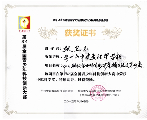 日前,从第30届全国青少年科技创新大赛上传来喜讯,惠州市惠城区青少年科技辅导员、中建麦绍棠学校张卫红老师的发明《中日韩汉字四体笔形字库、输入法及笔形表》荣获科技辅导员创新项目科技发明类二等奖、“中鸣科学奖”专项奖。该项目为惠州市师生参加本届全国大赛的唯一项目。