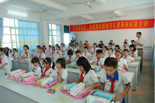 活动最后,市、县科协的有关领导为励志班的每名同学赠送了一套书包、水壶、铅笔等学习用品。