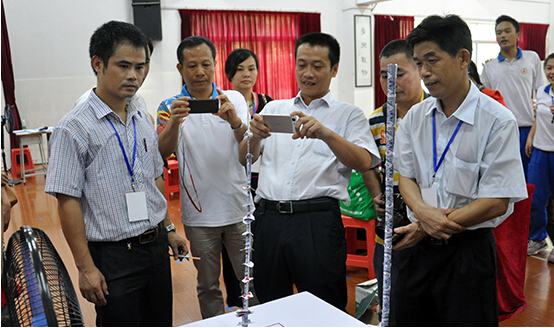 广东省青少年科技中心主任叶新鹏(右二)、广东省青少年科技创新实践能力挑战赛总裁判长王超荣(左二)在观摩比赛