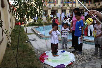 到了体验项目更是精彩动人:放大的世界,旋转的气球,水果钢琴,火山爆发,电光球,强大的脑电波,筷子的神力,拍灭蜡烛,漂浮的回形针,科幻小电影,冲天火箭,泡泡球,消失的硬币,彩色音阶杯,趣味瓶子,会跳舞的磁粉,吹小球,创意积木,暗箱摸物,认识茶叶,千里目,魔法环,小猫钓鱼,魔幻泡泡。二十四个项目,带着童趣的游戏玩法,融入了神奇的科学世界。在欢乐愉快的游戏中,小朋友们总是说:很好玩!为什么?
