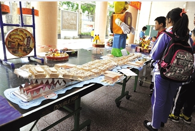 “月饼侠”液压机器人、多功能台灯、会走路的大公鸡,月饼盒小吉他……与挑战赛同期举办2015年全国青少年科学调查体验活动的广东特色项目“创客在行动”——月饼宝盒变形PK赛展评活动现场摆满了选手们手工制作的色彩艳丽、形状各异的作品。