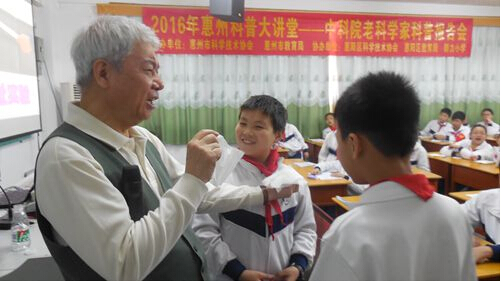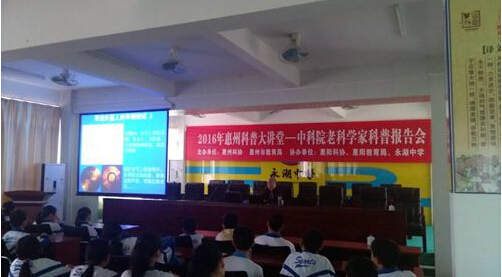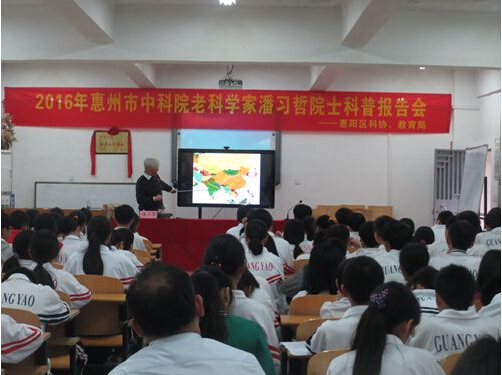 3月21日,2016年惠州科普大讲堂——中科院老科学家科普报告会首站在惠州市惠阳区举行。中科院白武明、徐文耀、高登义、陈洪、韩莉、郭传杰、陈贺能、潘习哲等8位老科学家应邀分别到惠阳区16所中小学校作巡回科普报告会,近5000名师生聆听了科学家们的精彩演讲。