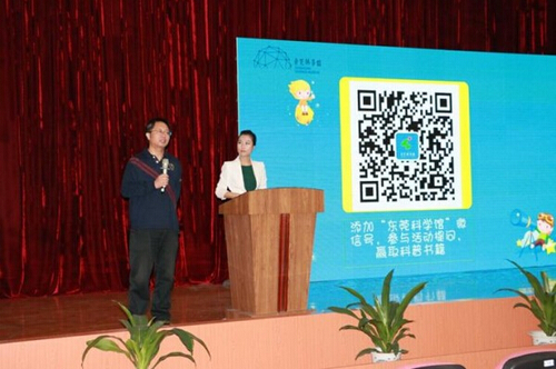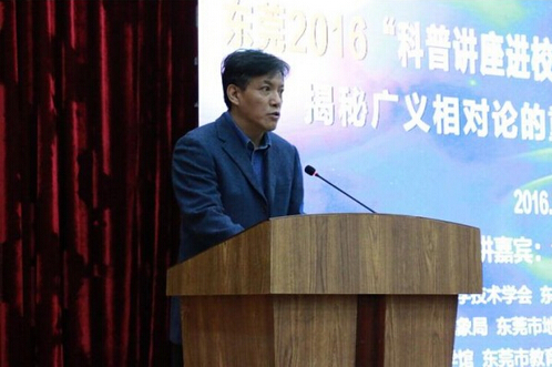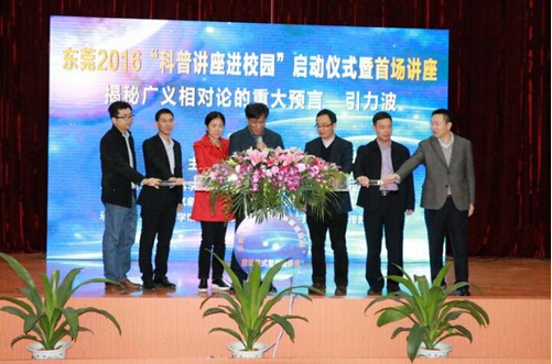 东莞2016“科普讲座进校园”系列活动启动仪式暨“揭秘广义相对论的重大预言——引力波” 首场讲座于3月26日上午在东莞科学馆影视报告厅隆重举行。市科协副主席李小兵,东莞市地震局副局长彭瑞,东莞市海洋与渔业局副调研员钟碧贤,东莞市教育局教研室副主任严考全,东莞市环保宣教中心熊国柱主任,东莞市地震局办公室副主任黄宇东,东莞科学馆馆长黄立强,东莞科学馆副馆长刘凤云等领导嘉宾出席了启动仪式及讲座。
