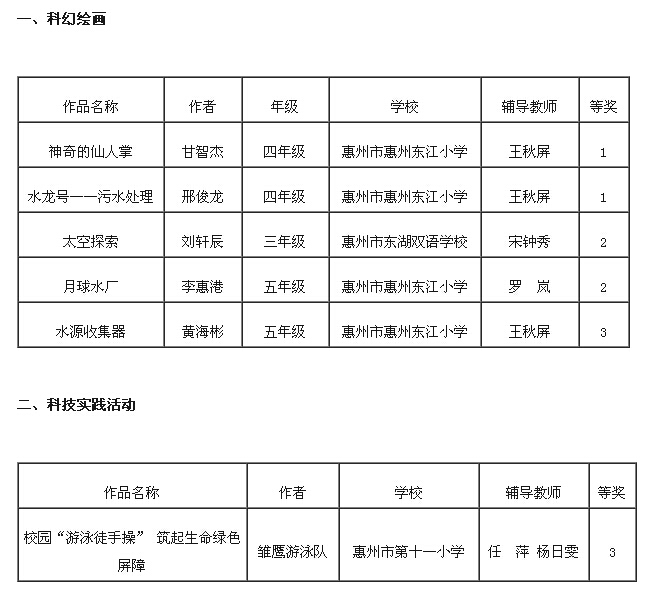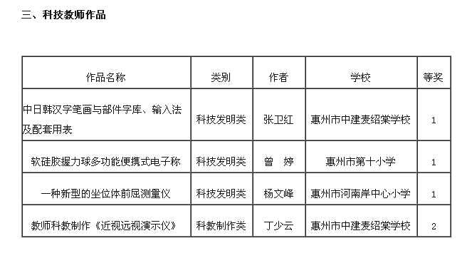 4月8日至10日,由省科协、省教育厅、省科技厅、省知识产权局和珠海市政府共同主办的第31届广东省青少年科技创新大赛在珠海市第一中学隆重举行。惠州市惠城区有10件科技作品在本届大赛中获奖,其中一等奖5件,二等奖3件,三等奖2件。区科协主席李金治被评为本届大赛十佳优秀组织工作者。
