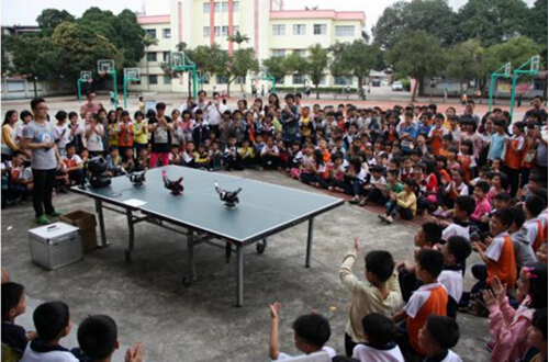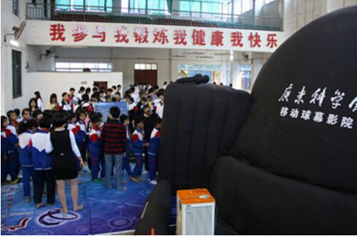 在开平市月山镇初级中学和苍城镇中心小学,广东“科普大篷车”载着神奇的科普仪器驶进校园里,有带来了“蛇头咬蛇尾”、“大象穿老鼠洞”、“四星拼一星”、“动物视觉(鱼的眼睛)”、“透视墙”、“拓扑之解环”等互动展品,更有3D球幕电影。现场参观整齐有序,同学们面对从未见过的新奇科普展品,时而锁眉、时而大笑。航模表演更是把整场活动的气氛推向高潮,飞机穿梭拉烟、翻滚,现场掌声雷动。