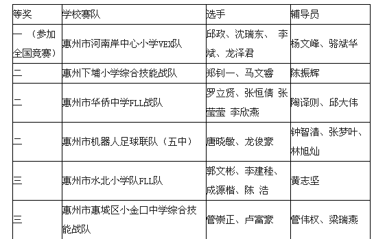 5月15日,由广东省科协主办,肇庆市科协、四会市人民政府支持举办的第十六届广东省青少年机器人竞赛圆满结束,惠城区队继续保持优异成绩,有6支队伍参加本届竞赛并获奖,两队获专项奖,其中:河南岸中心小学VEX队获一等奖,将代表广东参加今年7月在北京举行的中国青少年机器人竞赛;下埔小学综合技能队、华侨中学FLL队和五中足球队获二等奖;水北小学FLL队、小金口中学综合技能队获三奖。其中河南岸中心小学VEX队获“博思专项奖”,小金口中学综合技能队获“中鸣专项奖”。