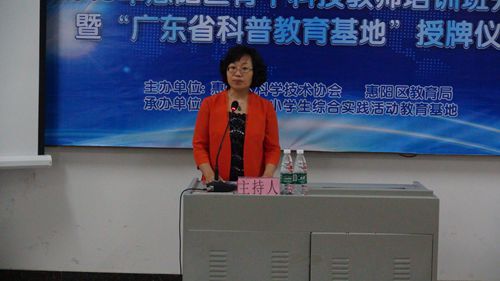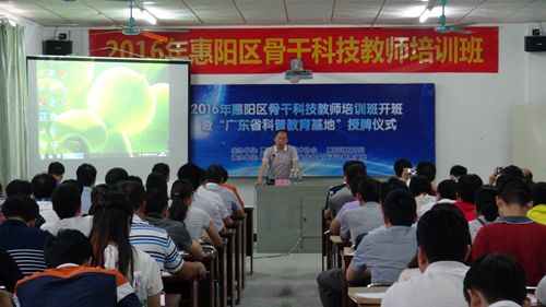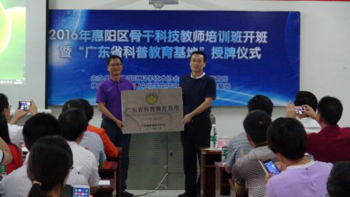 5月20日上午,惠州市惠阳区在区中小学生综合实践活动教育基地举行2016年惠阳区骨干科技教师培训班开班暨“广东省科普教育基地”授牌仪式。省青少年科技中心主任叶新鹏、副主任李耀庭,副区长朱文转,市科协副调研员陈浩峰及区府办、区科协、区教育局等相关领导出席仪式。