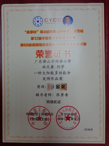 第12届中国青少年创造力大赛全国总决赛暨第68届德国纽伦堡国际发明展中国区选拔赛、“晶草杯”第四届钟南山创新奖,5月14日在广东实验中学举行。佛山市同济小学六(9)林天豪小院士的发明作品奖《一种太阳能多功能伞》荣获金奖,五(2)吴子恒小院士的《多功能海上飞行记录仪》获银奖,四(4)蒋丰泽小院士的《多功能机器人》、五(2)黄力鸿小院士的《具有电脑功能可佩戴式新型手机》和五(7)李卓惟小院士的《新型一种夹子存取器》获铜奖,蒋丰泽和李卓惟合作设计的奖杯获“钟南山创新奖杯团体奖”铜奖,林天豪小院士的《我的发明梦想》个人演讲获银奖,张秀香老师荣获优秀辅导奖。