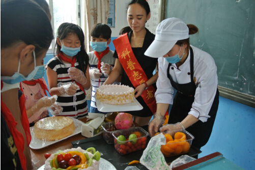 小朋友们好奇的围成一团,近距离的观赏蛋糕制作的过程,并戴上手套,自己动手试做,现场充满了好奇和欢乐的气氛。