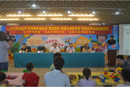 5月28日,由汕头市科技局、汕头市委宣传部、汕头市科协共同主办,汕头科技馆、汕头市科普教育联盟协办,广东邦宝益智玩具股份有限公司承办的2016年汕头市“科技进步活动月”暨邦宝杯“我是未来科学家”系列科普活动启动仪式在汕头科技馆邦宝积木益智玩学体验园举行。汕头市科技局杨志刚局长,汕头市科协曹世宝副调研员、汕头馆郭耀光馆长、广东邦宝益智股份有限公司副总经理姜小红和汕头市科协科普部等负责同志参加了活动。