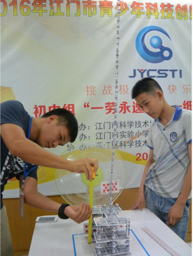 本次竞赛是江门市青少年科普活动的一场盛会,也是江门市首届青少年科技创新实践能力挑战赛。全市80支队伍250多名学生参加现场角逐,赛事精彩纷呈,高潮迭起,高中组为“奔跑吧,环保车”(塑料瓶车障碍赛);初中组为“挺立吧,纸牌塔”(纸牌结构抗风赛);小学组为“飞翔吧,纸火箭”(纸箭飞梭远准赛)。在历时一天的比赛中,学生选手们秉承“挑战极限、快乐无穷”的主题精神,积极思考、发挥创意,各展所长,11支队伍比赛成绩突出获得各组别一等奖,其他队伍分别获得二、三等奖。