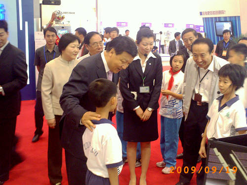 2009919日上午,中共中央政治局常委、中央书记处书记、国家副主席习近平和王兆国、刘淇、刘云山、刘延东、李源潮、路甬祥、韩启德等领导同志出席了2009年全国科普日活动,并来到广州市旧部前小学展位前,兴致勃勃地参观了该校的电脑机器人创意作品《我们的登月之旅》,认真听取李浩天、黎浩洋、廖伟纯三位同学的作品讲解,了解我省青少年科技教育情况,对我省青少年敢于创新、勇于实践的精神以及高超的动手能力给予了高度的赞杨!