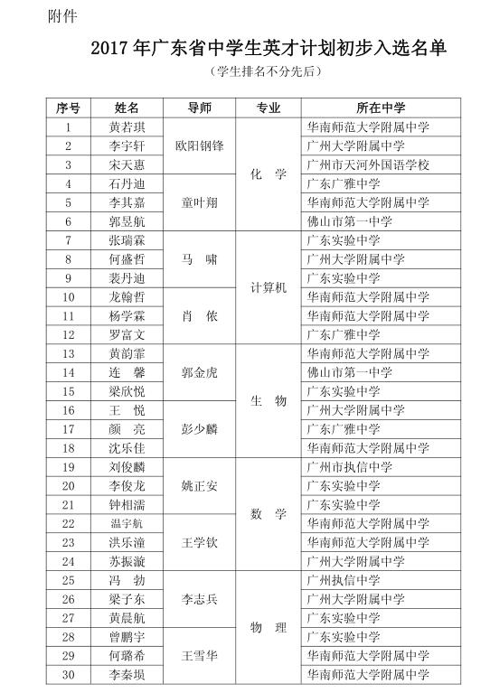 根据中国科协办公厅、教育部办公厅《关于继续开展2017年“英才计划”工作的通知》(科协办发青字〔2016〕32号)精神,省科协、省教育厅和中山大学将组织开展2017年广东省中学生英才计划。2016年10-12月,经广州、珠海、佛山和省直属学校的选拔推荐,共有75名学生进入中山大学组织的面试考核,最后选定30名初步入选2017年广东省中学生英才计划,现将名单公示如下。公示期7天,自2016年12月8日至14日。期间如有异议,请实名与联系人联系。