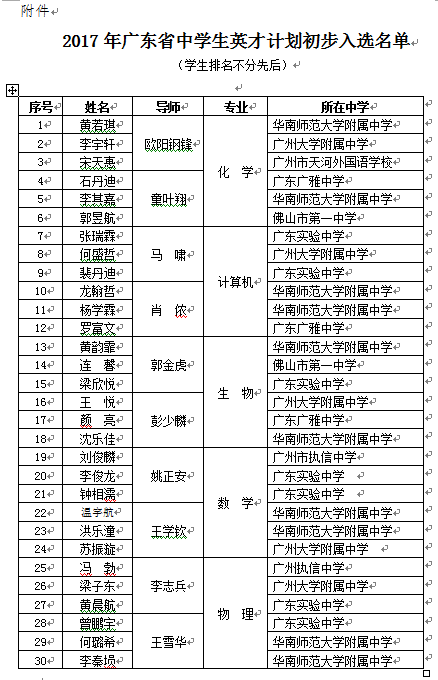 附件:2017年广东省中学生英才计划初步入选名单