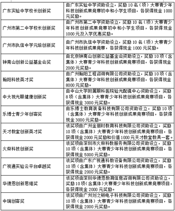 (1)自行发放:华南师范大学附属中学科技创新奖、广州市第二中学校长创新奖、广州市执信中学元培创新奖、钟南山创新公益基金会奖、广视通实验云平台卓越奖、中瑞创客奖等6项专项奖,由设奖单位在3月19日上午闭幕式后现场发放,获奖者直接到广州市执信中学元培楼架空层凭身份证或学生证领取。