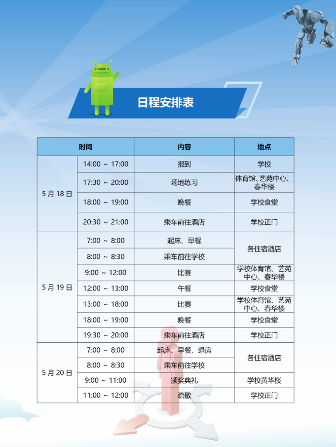 由省科协主办的第18届广东省青少年机器人竞赛,定于5月18日至20日在广州市广外附设外语学校举行,现将日程安排、参赛队伍和奖项设置等有关事项通告如下: