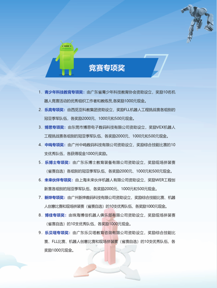 3.奖项设置:本届省赛按比赛项目和组别设立一、二、三等奖,选拔优秀队伍参加今年7月在贵州省贵阳市举行的全国赛。赛事还得到有关单位的支持,共设立9个专项奖,奖励积极开展机器人活动的优秀学校、教练员和学生。
