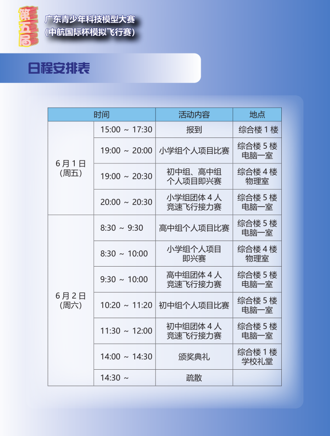 由省青少年科技教育协会、省航空学会共同主办的第5届广东青少年科技模型大赛——中航国际杯模拟飞行赛定于6月1日至2日在中山市杨仙逸中学举行,现将日程安排、参赛队伍名单和奖项设置等有关事项通告如下: