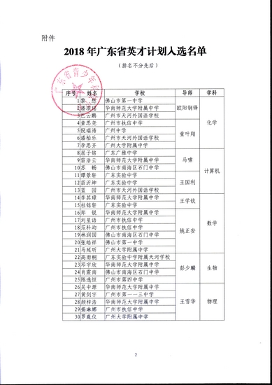 根据《广东省科学技术协会 广东省教育厅关于开展2018年广东省“英才计划”工作的通知》(粤科协联〔2017〕21号)精神,省管理办公室于4-8月对2018年初步入选的38名学生进行中期评估。经学生自评、中学教师评估和导师及其团队的评估,2018年有30名学生获得通过,正式入选培养计划,1名学生因病休学退出,7名学生被导师建议退出培养。