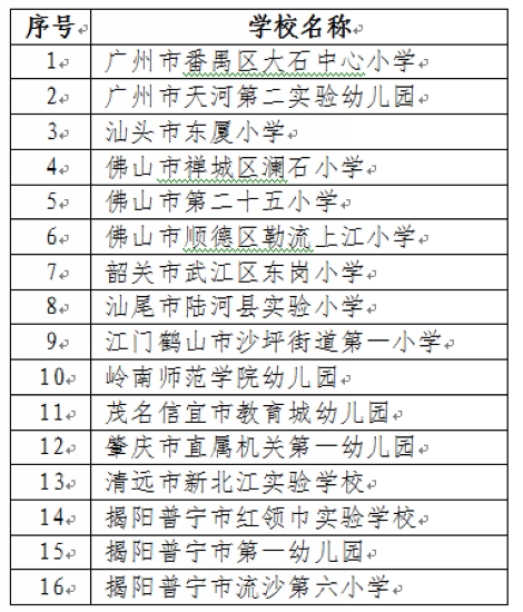 根据《关于创建第二批广东青少年科技模型大赛万格·乐博士杯儿童创意建构赛活动示范园校的通知》(粤青科教〔2018〕18号)精神,为了培养儿童的科技创新和动手实践能力,普及和推广儿童创意建构赛活动,省青少年科技教育协会、省青少年科技中心将分2批在全省创建30所活动示范园校,现从24所申报小学和幼儿园中评出第二批16所活动示范园校。