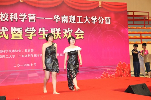 中山大学的营员代表们用图片、视频、PPT等重温了一周的点点滴滴,分享了科学营期间的快乐时光。华南理工大学分营继续以一台精彩的联欢晚会作为总结,环保服装设计及风采show、歌唱表演、歌曲串烧、悠悠球表演……仅仅4天时间,这些营员就组织起一场精彩的科学文艺秀,这一个个精彩的节目无不展现营员们的青春活力,彰显他们的科技创意!