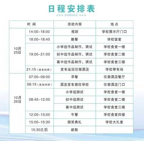 2.报到时间:25日18:00前抵达揭阳市华美实验学校报到,(地址:揭阳市榕城区仙桥街道崇文路南)当晚19:00-21:00,全体参赛选手进行作品制作。