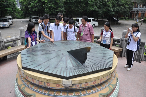 华工分营,营员和带队老师在志愿者导引下参观“日晷”。