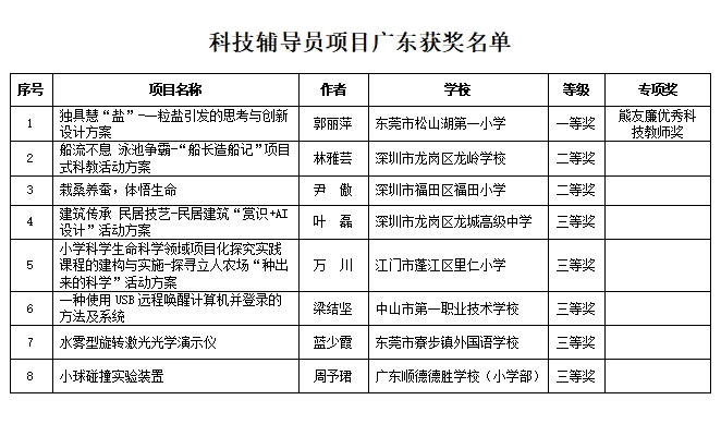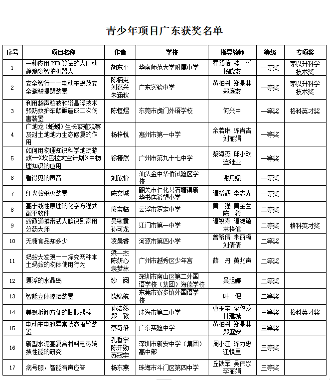 7月25日至29日,第38届全国青少年科技创新大赛在天津市举行,广东代表队35名师生27个项目参赛,喜获青少年项目一等奖7项、二等奖6项、三等奖4项、专项奖5项,科技辅导员项目一等奖1项、二等奖2项、三等奖5项、专项奖1项。