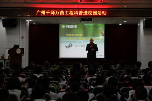 2015年12月30日,广州市青少年科技中心、市自然观察协会、荔湾区科协、西关实验小学共同举办“千师万苗工程科普进校园”活动。活动邀请市自然观察协会名誉会长曾庆平为学生进行了观鸟知识讲座,他用生动有趣的语言,为学生普及了鸟类的有关知识,宣传了爱护鸟类的重要性,呼吁大家一起来爱护我们的大自然,维持地球的生态平衡,在学生中引起了很大的反响。在讲座后,学生饶有趣味地参加了各项科技活动,并在动手活动中学到了与天气相关的科学知识,也明白了爱护环境的重要性。