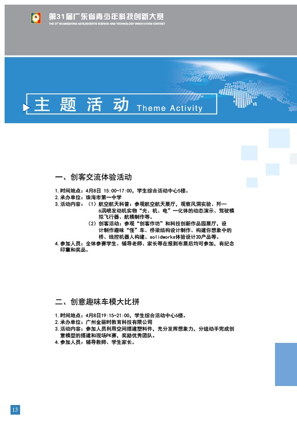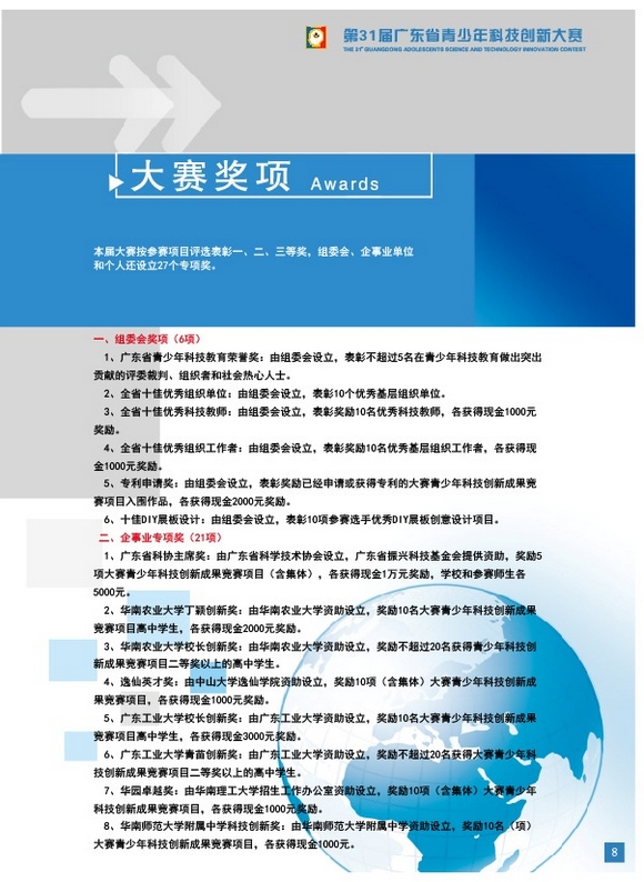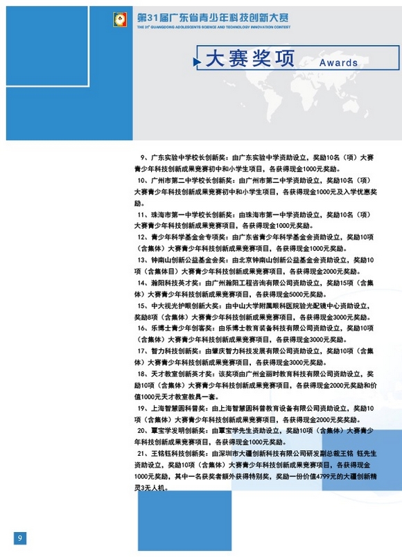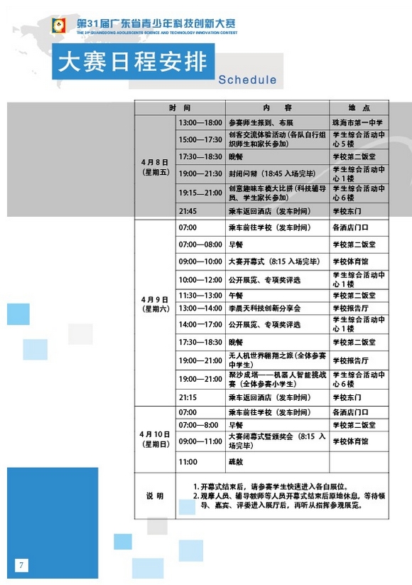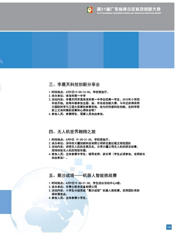 由省科协、省教育厅、省科技厅、省知识产权局和珠海市政府联合主办的第31届广东省青少年科技创新大赛定于2016年4月8日至10日在珠海市第一中学举行。在各级科协、教育和科技部门的关心,以及各高校、企事业单位的支持下,本届大赛各项筹备工作已基本完成,届时将为大家送上更为精彩的科技体验过程,争取办成师生家长同欢乐的创新嘉年华,热切期待全省参赛师生、家长和观摩人员一同品鉴我省年度最大的青少年科技创新盛事。 1.日程安排 2.大赛奖项 3.大赛活动 广东省青少年科技创新大赛组委会 2016年3月30日